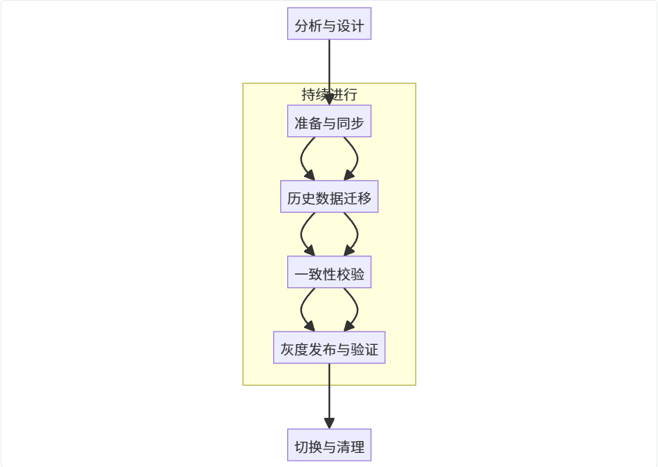 - 阶段四:一致性校验 (Consistency Verification) - 通过数据比对与对账,验证迁移的准确性。